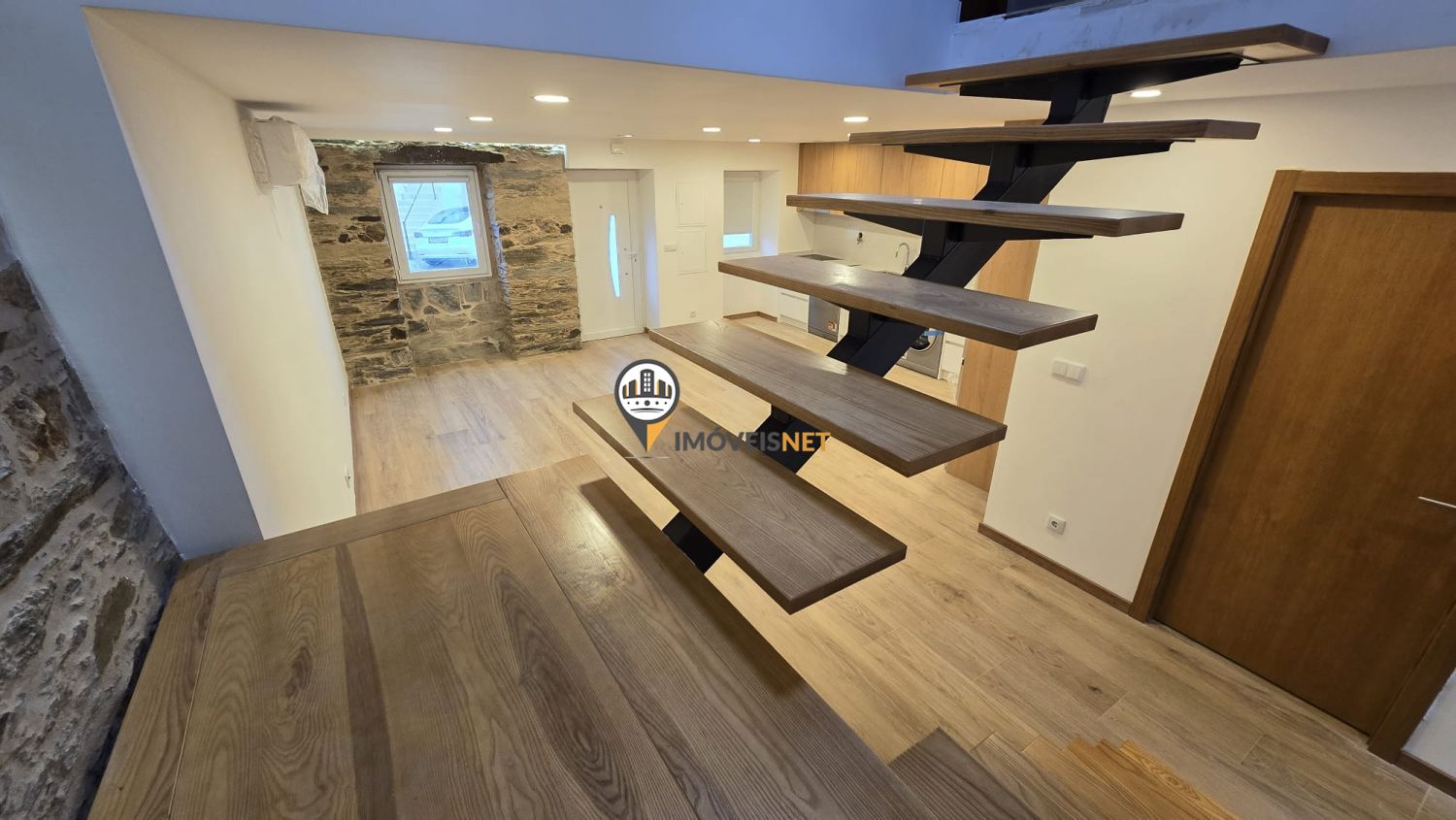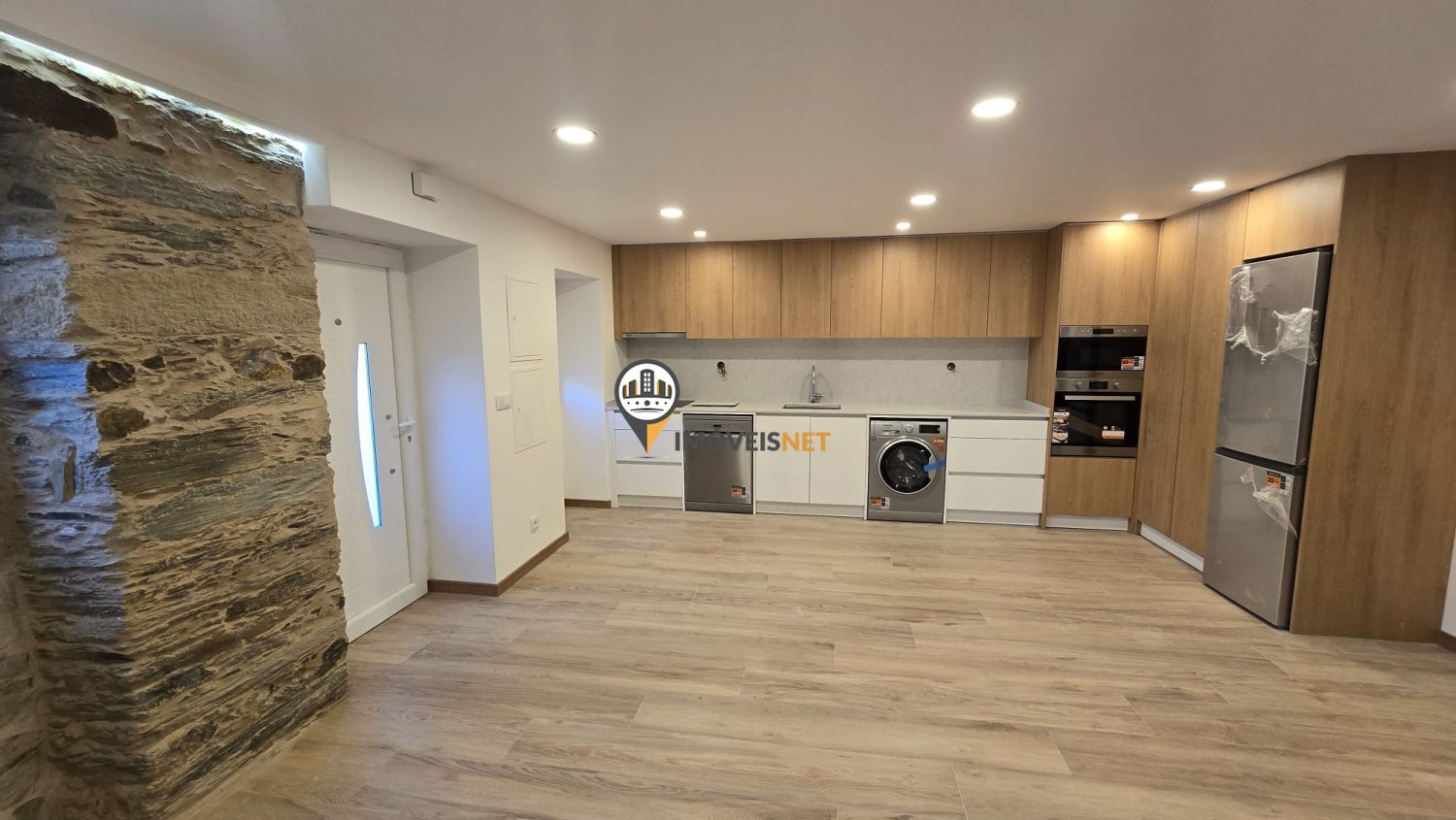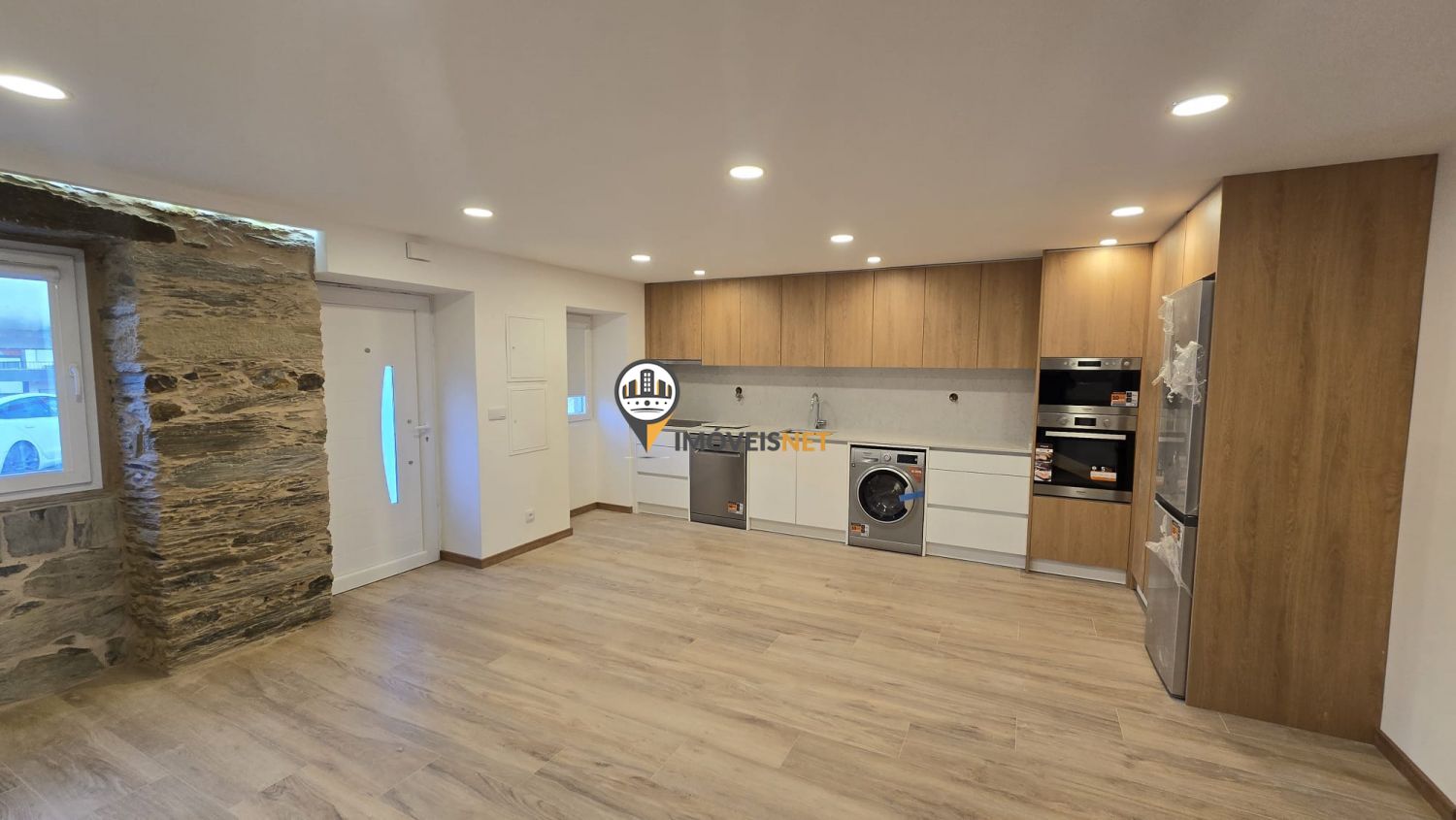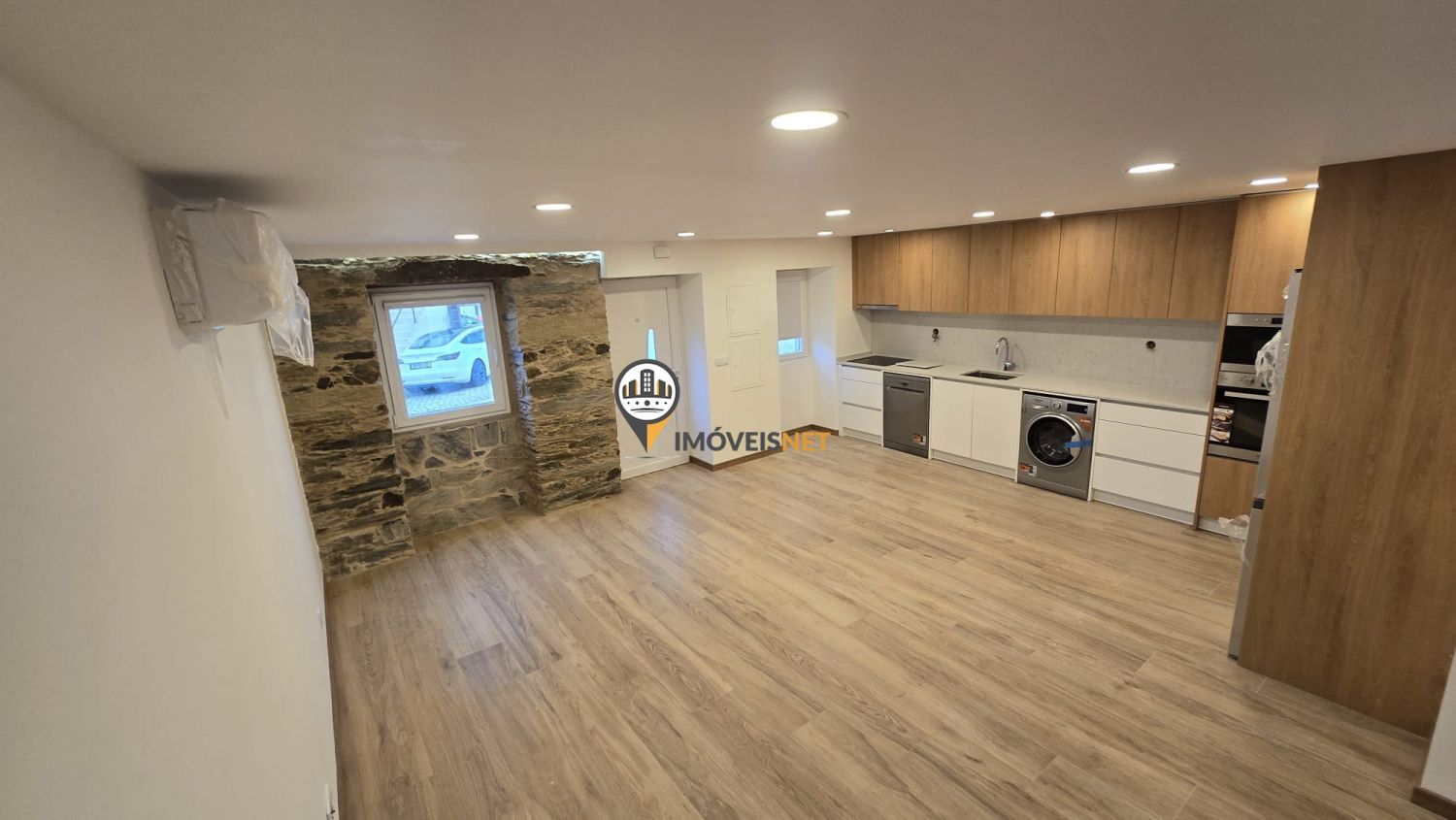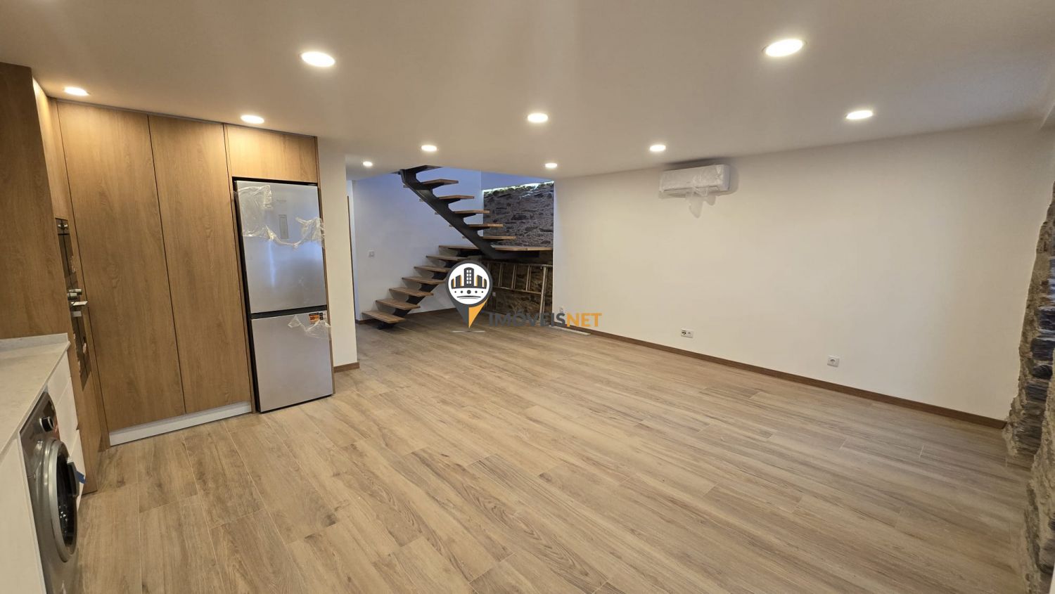 No rés do chão encontra uma ampla cozinha e sala em conceito open space, um quarto e uma casa de banho completa.
